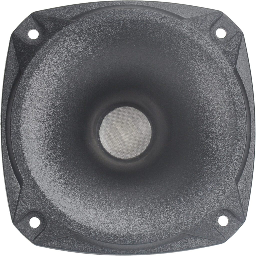 Phase plug with its short openings and high flare rate, assures low distortion with excellent mid-high frequency reproduction. Powerful ceramic magnet assembly has been designed to obtain high Gauss in the gap within a compact ferrite motor structure.