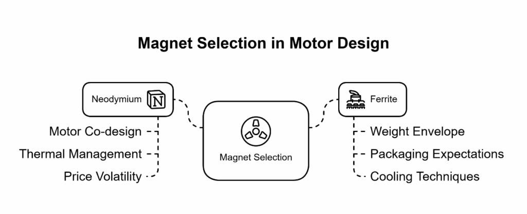 Plan Magnet Choices as Risk Dials: Apply neodymium for power-to-weight only with motor/cooling co-design and a ferrite fallback; choose ferrite when BOM stability and predictable packaging matter most.