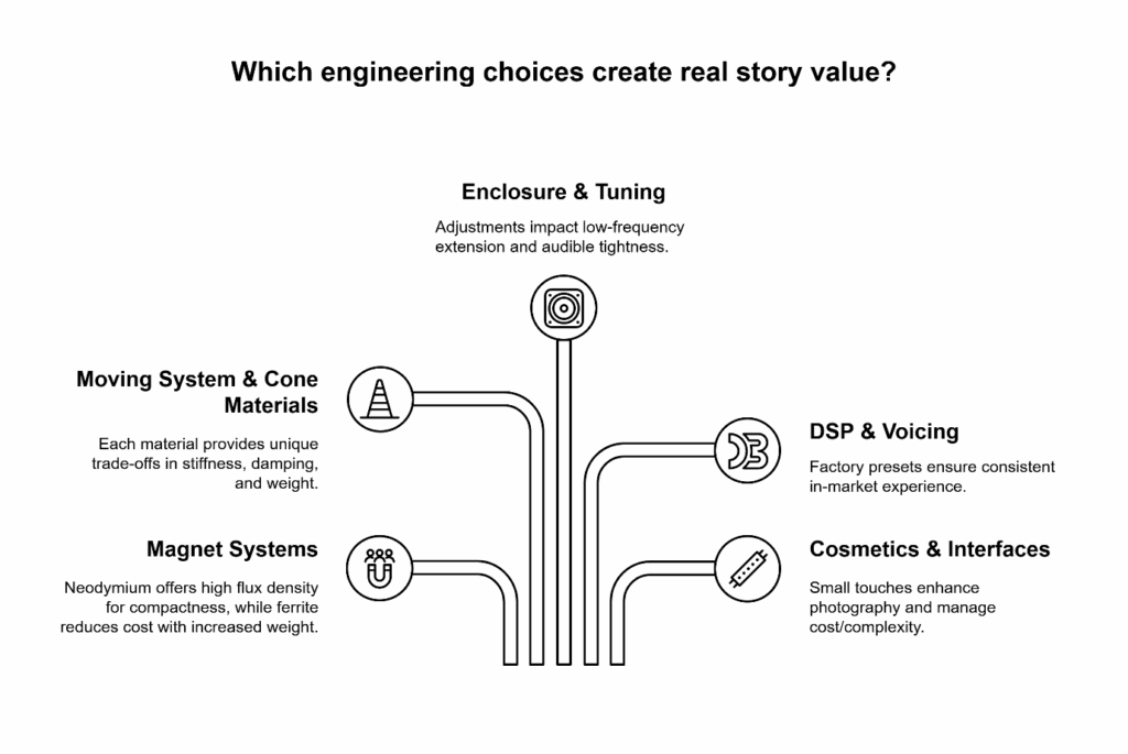 Answer: It varies by category, but common high-leverage levers include neodymium vs. ferrite magnet architectures, cone/surround systems, enclosure geometry/porting, and DSP voicing. The constant is verifiability—tie each choice to a test and a story.